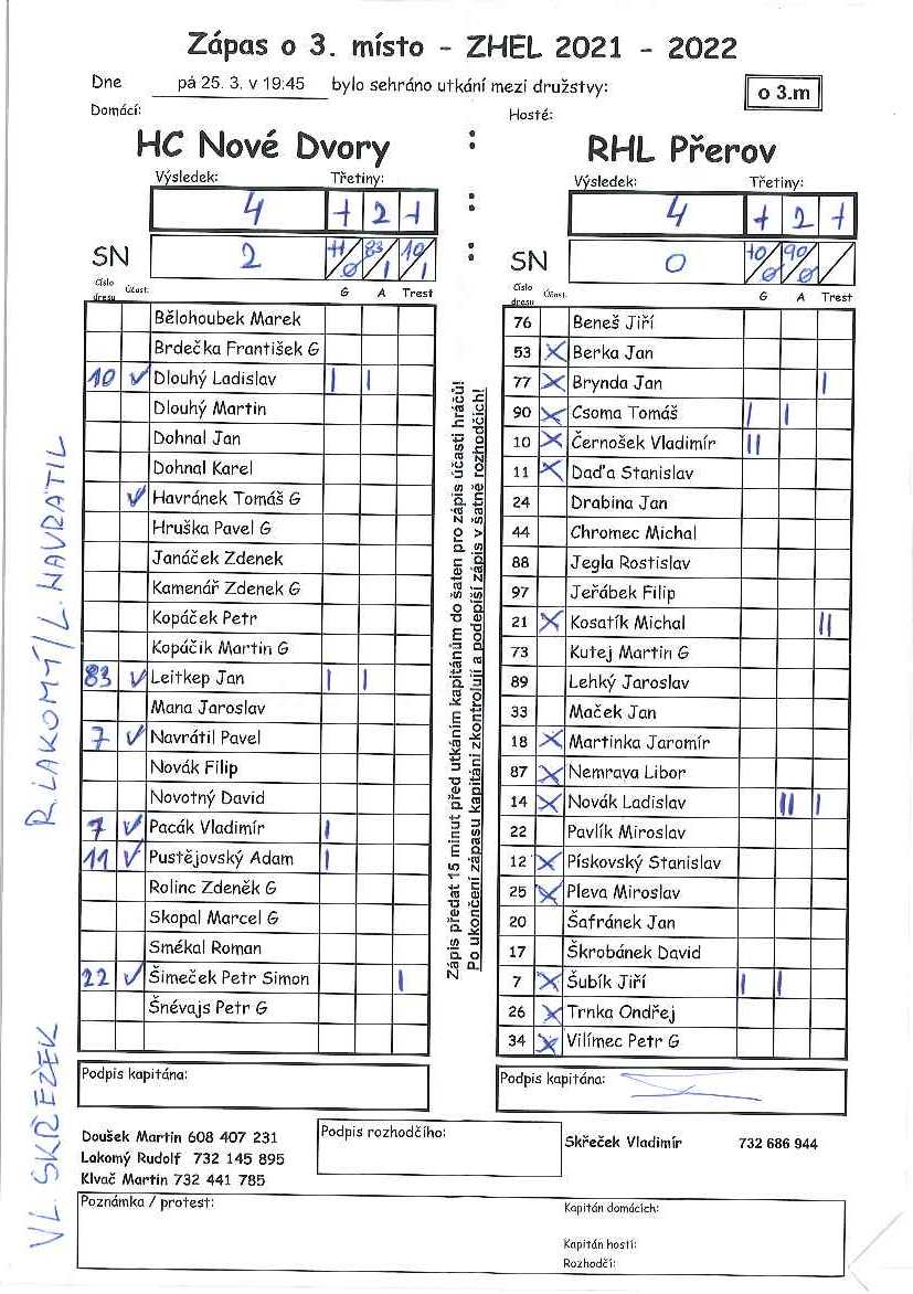 | 1 | pá 25.03.2022 19:45 | Lakomý Rudolf + Navrátil Lukáš | 4 : 4 1:1, 2:2, 1:1 - SN 2:0 | 1 : 0 | ||||